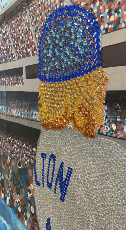 Part of my Rock Stars series, This is a recreation of the famous photo of Elton John performing at the LA Dodgers stadium in 1975, Like his iconic outfit, Elton himself is entirely comprised of over 1000 rhinestones